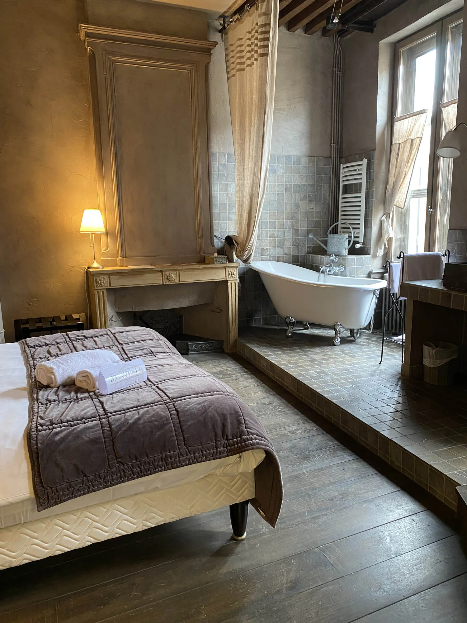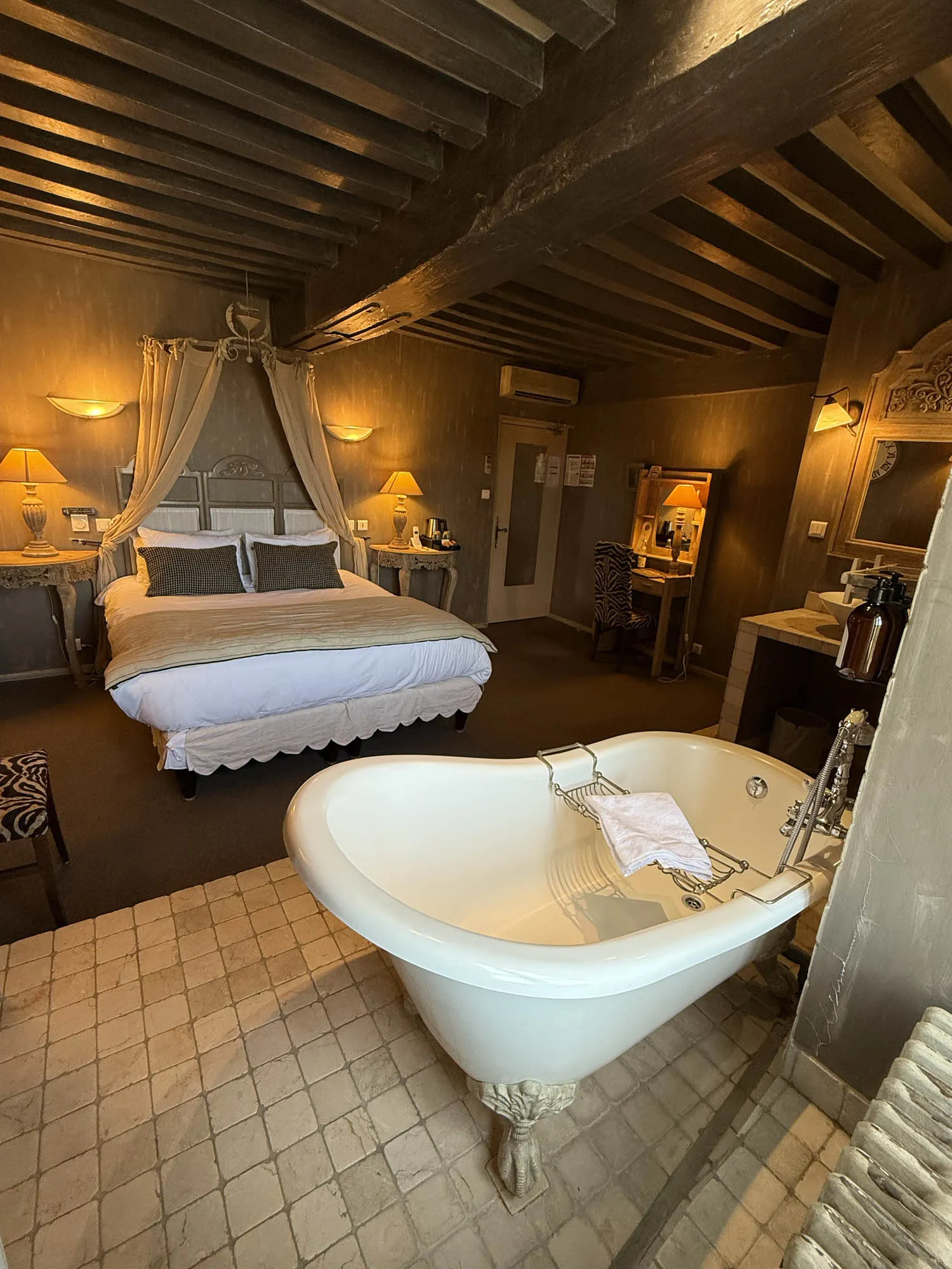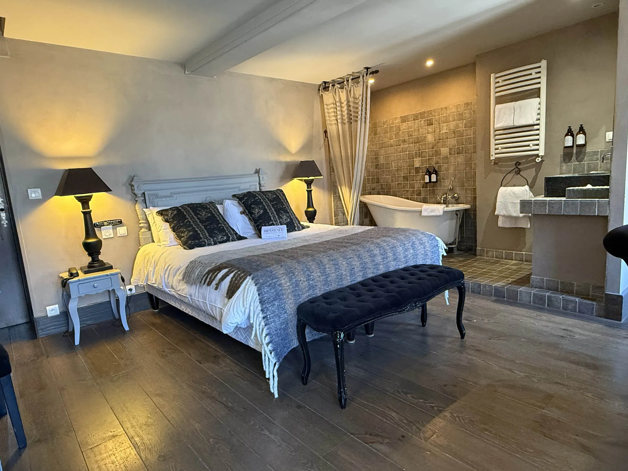 Spacieuse et élégante, la chambre Deluxe mêle raffinement et confort. Sa décoration soigneusement travaillée crée une atmosphère propice à la détente. Certaines chambres se distinguent par des éléments uniques, comme une salle de bain nichée dans la tour médiévale ou une vue privilégiée sur les toits de la cité historique.